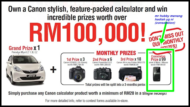 nama mr hubby menang conso prize--hadiah smart mouse (3-in-1) --Canon X Mark 3-in-1 mouse worth RM199 :) oklah tu--sbb modal RM25 me beli canon calculator utk join contest ni atas nama mr hubby :)