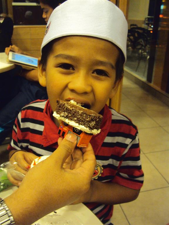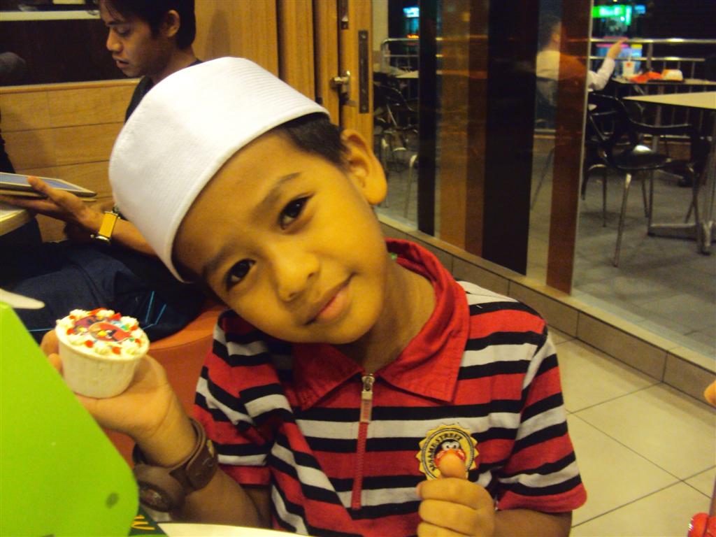 sbb me tak buat bday party utk my zharfan thn ni, so masa mlm bday tu, me bwk zharfan pegi kedai kek (Pistachios) and suruh dia pilih cup cake mana yg dia berkenan :) kira ganti bday cake hehhe then weolls singgah kat McD ajer...mula2 nak gi Pizza Hut, tapi zharfan tak mau sbb dia dh mengantuk :p
