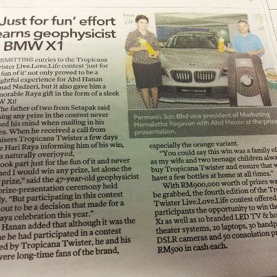 My frend pernah menang 3rd prize.. tu pun dia hantar beratus2 penyertaan. Yg menang grand prize BMW waktu tu peniaga kedai kott.. mmg lagi banyak entry nyer uhuhuhu