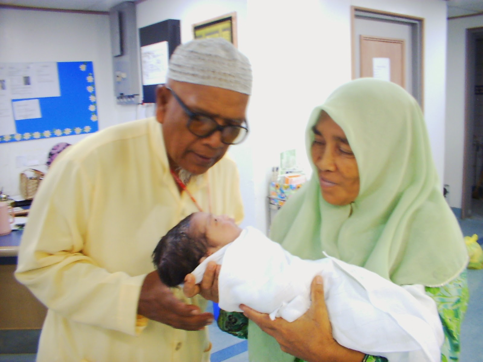 gmbr kenangan..zharfan slps few moments of birth 24/5/2005..with arwah tok ayah dan nenek