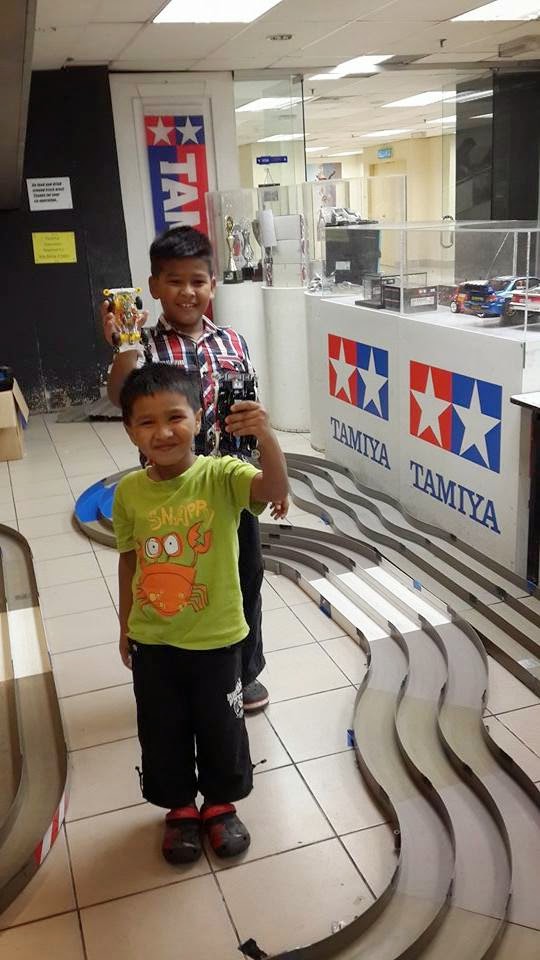 so far zharfan dh ada 3 buah keta tamiya tu in his collection...yg latest sbb me belanja beli as his bday gift...Tamiya ori ni..harga around RM100+ gak utk every piece (tamiya ni racing car)..
